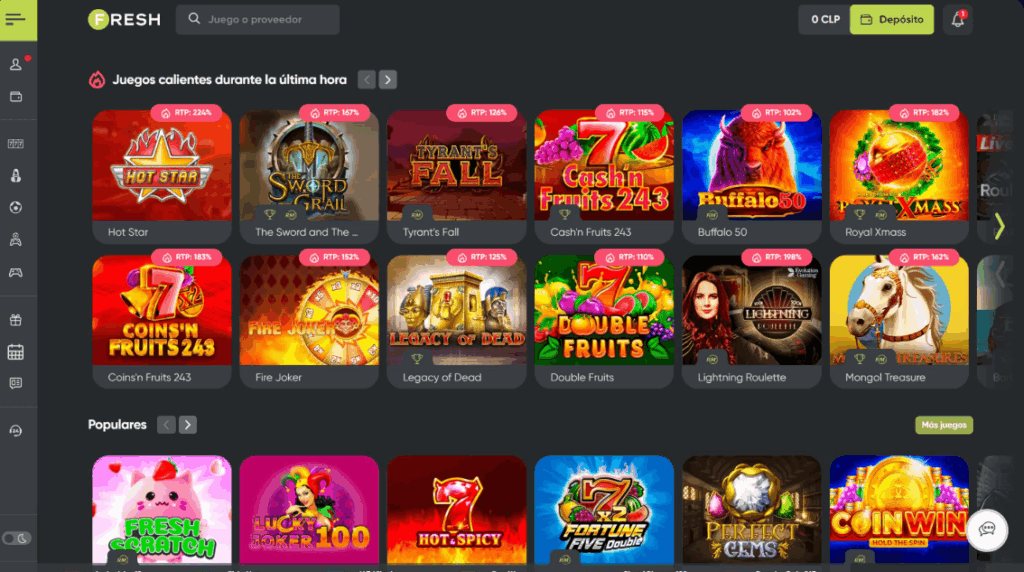 - Requisito de Depósito Inicial: Para acceder a la extensa biblioteca de juegos ofrecida por Fresh Casino, asegúrate de hacer un depósito mínimo de $20,000 CLP. Este depósito es necesario para desbloquear toda la gama de opciones de juego disponibles para los miembros.
