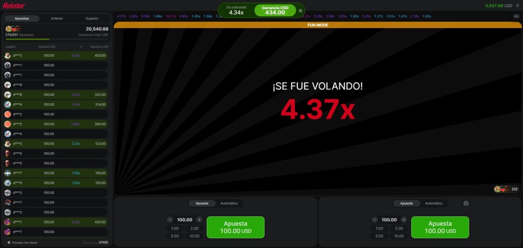 En Aviator, el juego comienza cuando el avión inicia su ascenso, activando la mecánica central del multiplicador. Este comienza en 1x y aumenta conforme el avión sube. Es esencial decidir cuándo retirar las ganancias, evaluando el equilibrio entre el deseo de obtener multiplicadores mayores y el riesgo de perderlo todo si el avión se estrella. La mayoría de las rondas no presentan multiplicadores excesivamente altos, generalmente permanecen por debajo de x4. Sin embargo, cada 60 a 80 minutos, podría aparecer un multiplicador de x200. Participar en la comunidad del juego, compartir experiencias y perfeccionar estrategias es recomendable. Comprender cuándo es el momento oportuno para asegurar las ganancias y celebrarlas es parte fundamental de pertenecer a este grupo dinámico.